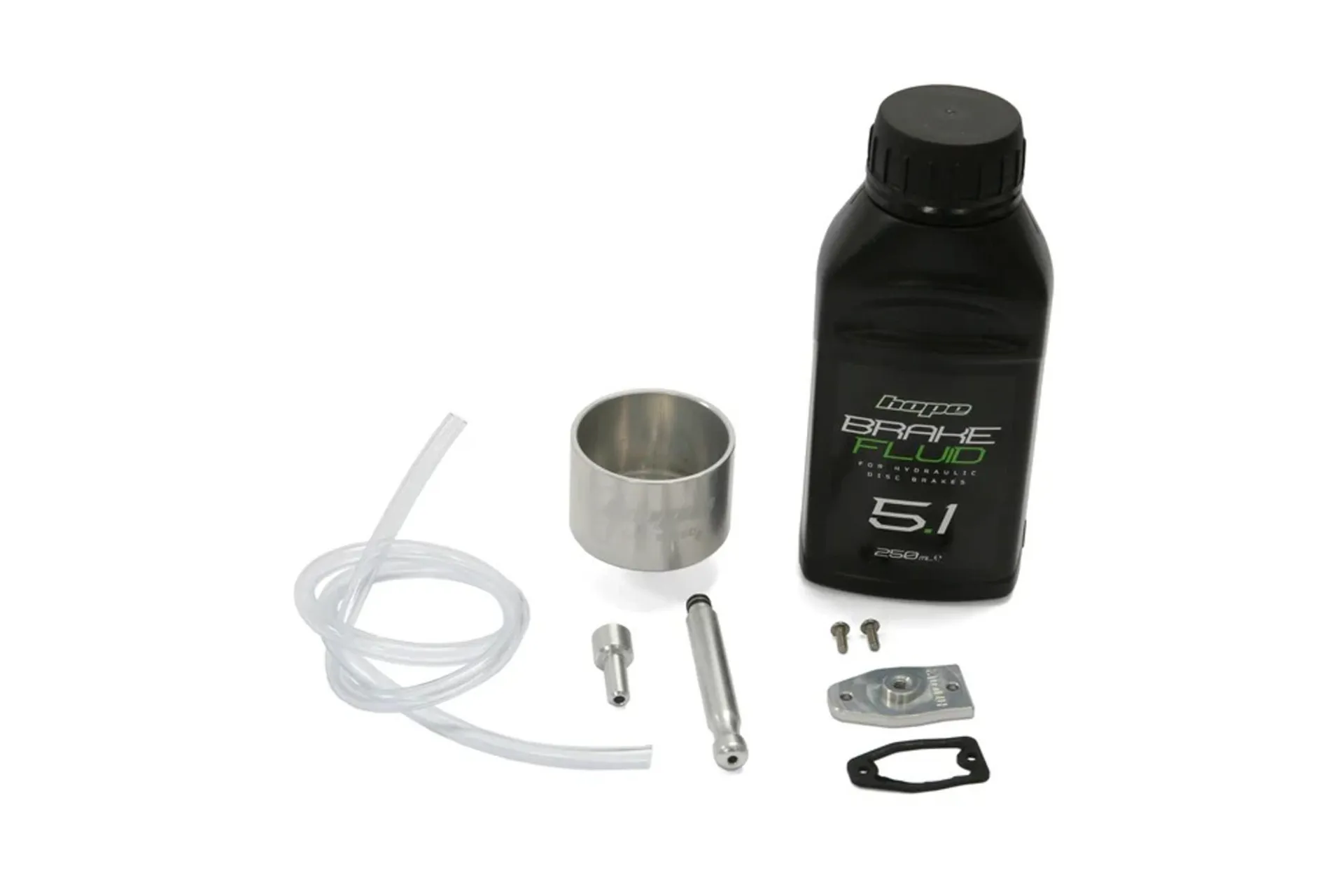 Hope Easy Bleed Kit for Tech and Tech Evo brakes includes DOT 5.1 fluid, cup, special reservoir seal and topcap, hose and caliper bleed fitting.
